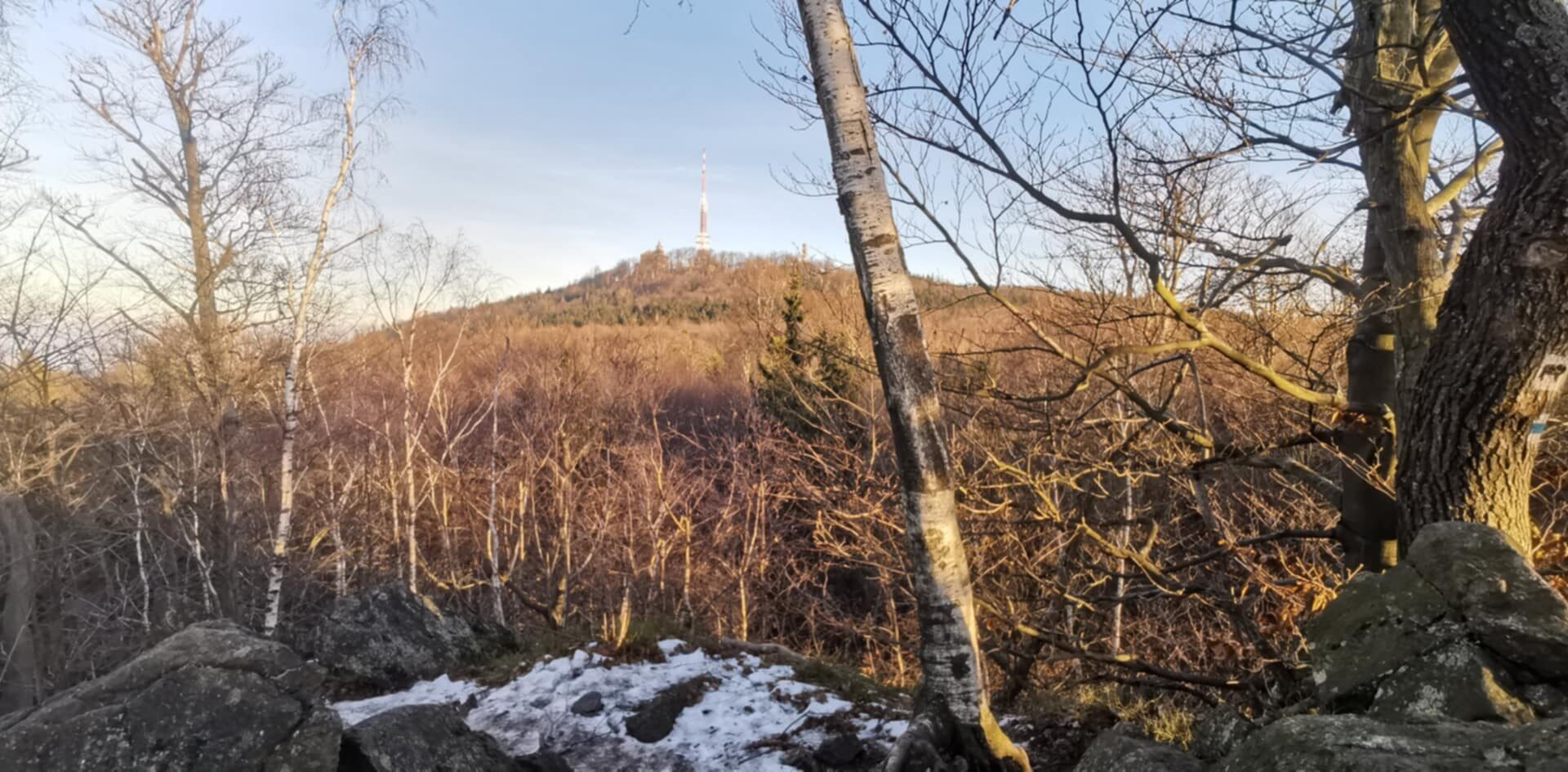 Pierwsze 2–3 kilometry to spokojny marsz. Dopiero dalej szlak skręca w leśną ścieżkę, która prowadzi prosto na szczyt. Po około 4 km marszu chłopaki byli już na górze. I tu zaskoczenie – ani widokowych panoram, ani wyczerpania. Na Chełmcu stoi schronisko i wieża widokowa, ale sam wierzchołek otoczony jest drzewami, więc widoki są ograniczone. Trzeba się wdrapać na wieżę widokową 😉