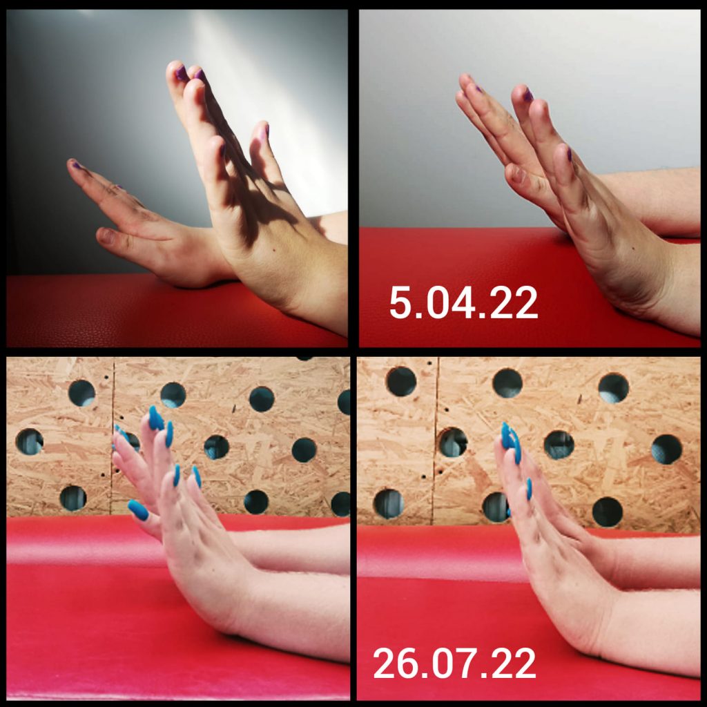 Martyna jest po złamaniu nadgarstka. Po zabiegu, zakres ruchu był bardzo ograniczony (lewy górny róg), lekarze twierdzili, że nie ma opcji, by nadgarstek wrócił do naturalnego zakresu ruchu. Zostały zastosowane różne techniki podczas treningów medycznych (rozluźnianie, rozciąganie, wzmacnianie) i po czterech miesiącach treningów zakres zgięcia jest zbliżony do naturalnego.Po lewej stronie są zdjęcia dłoni przed jednostką treningową, po prawej po.